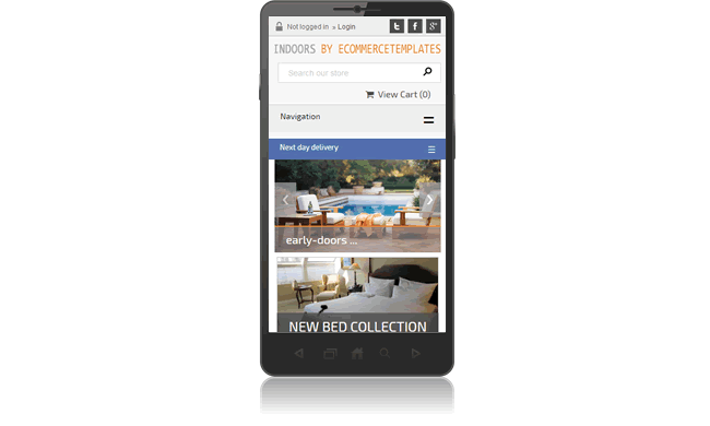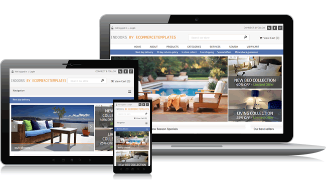 This template is called Premium Responsive Design Indoors and comes with the integrated Ecommerce Templates shopping cart software. It adapts to the size, resolution and orientation of the viewer's screen, meaning it looks great on a desktop computer, laptop, tablet and smartphone. The download provides everything you need to set up your online store, including the backend control panel for product, shipping, tax etc. administration.