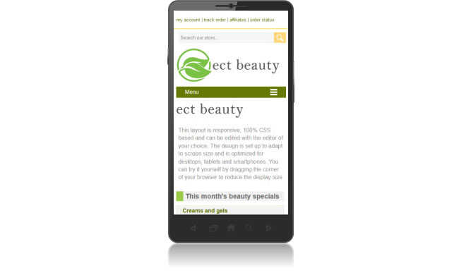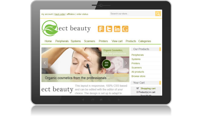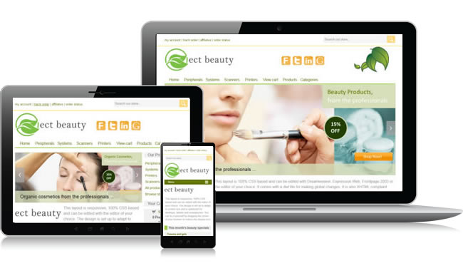 This template is called Responsive Design Beauty and comes with the integrated Ecommerce Templates shopping cart software. It adapts to the size, resolution and orientation of the viewer's screen, meaning it looks great on a desktop computer, laptop, tablet and smartphone. The download provides everything you need to set up your online store, including the backend control panel for product, shipping, tax etc. administration.
