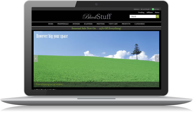 This template is called Responsive Design Black Stuff and comes with the integrated Ecommerce Templates shopping cart software. It adapts to the size, resolution and orientation of the viewer's screen, meaning it looks great on a desktop computer, laptop, tablet and smartphone. The download provides everything you need to set up your online store, including the backend control panel for product, shipping, tax etc. administration.