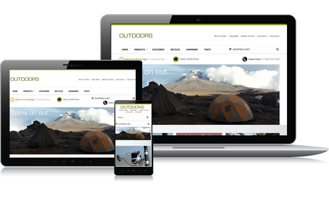 This template is called Responsive Design Outdoors and comes with the integrated Ecommerce Templates shopping cart software. It adapts to the size, resolution and orientation of the viewer's screen, meaning it looks great on a desktop computer, laptop, tablet and smartphone. The download provides everything you need to set up your online store, including the backend control panel for product, shipping, tax etc. administration.