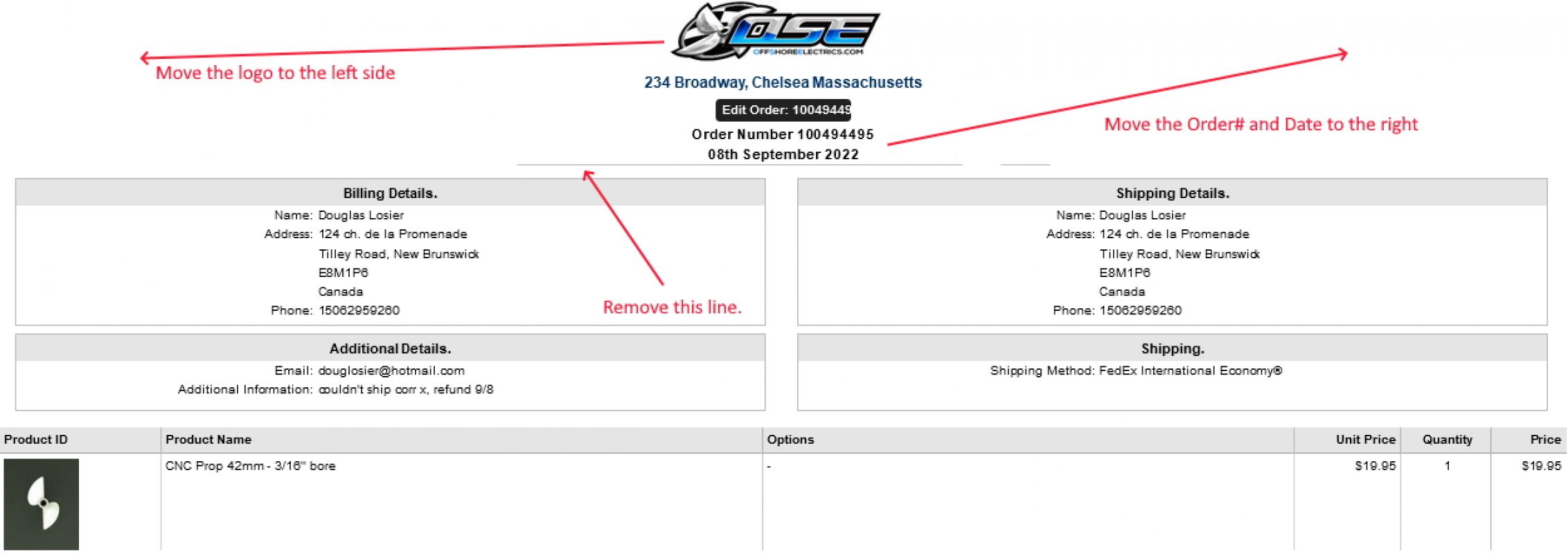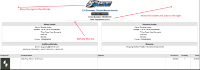 hi Steven In the file ectadmincustom.css around line 229 you have something like this... div.idanddate { width: 34%; font-size: 115%; font-weight: bold; border-bottom: 1px solid rgba(0, 0, 0, 0.3); } If you remove that "border-bottom" it will remove the underline. For moving the logo to the left, if you go to... ECT Admin -> Email Messages -> Invoice & Packing Slip Headers / Footers ...there is actually a "text-align:left" in the markup there. But then again I don't think it's actually possible to move the date, etc to the right as even though the buttons are not displayed, there is space left for those. Vince Click Here for Shopping Cart SoftwareClick Here to sign up for our newsletterClick Here for the latest updater