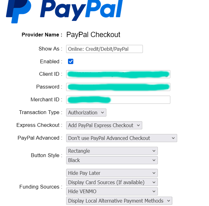 Here are the settings I'm currently using for PayPal in my Store Admin: Orders Admin: Payment Providers --