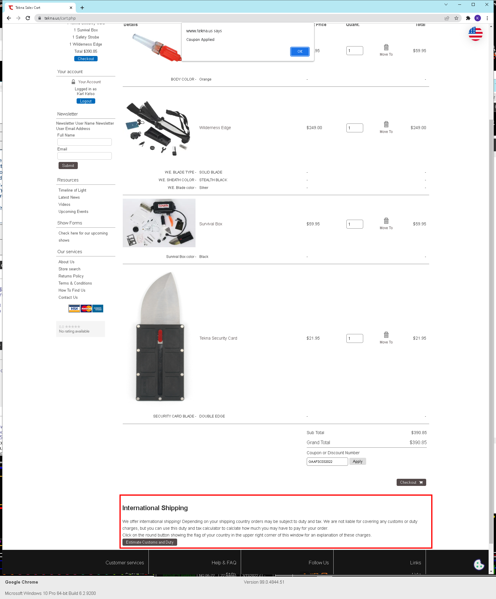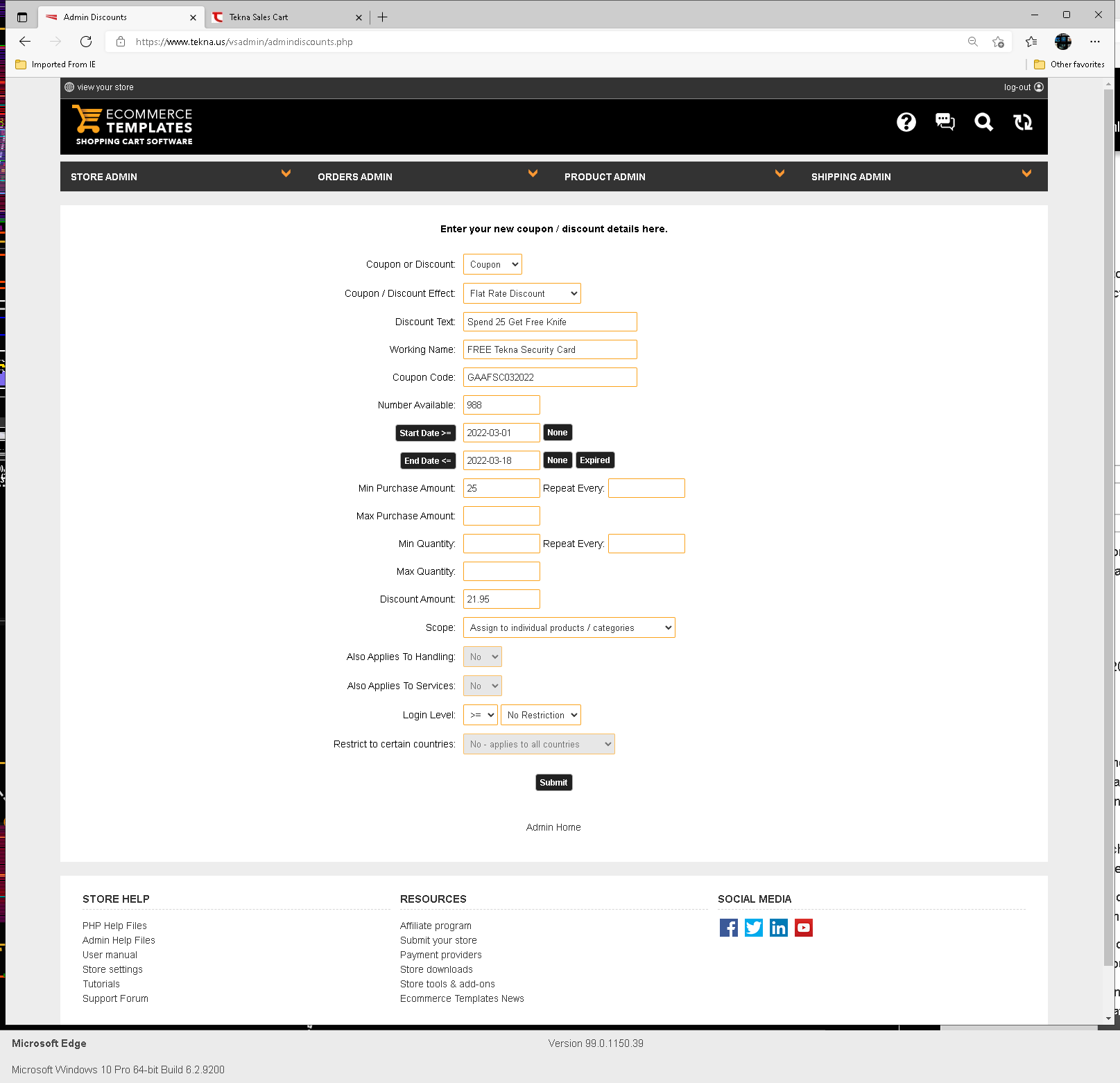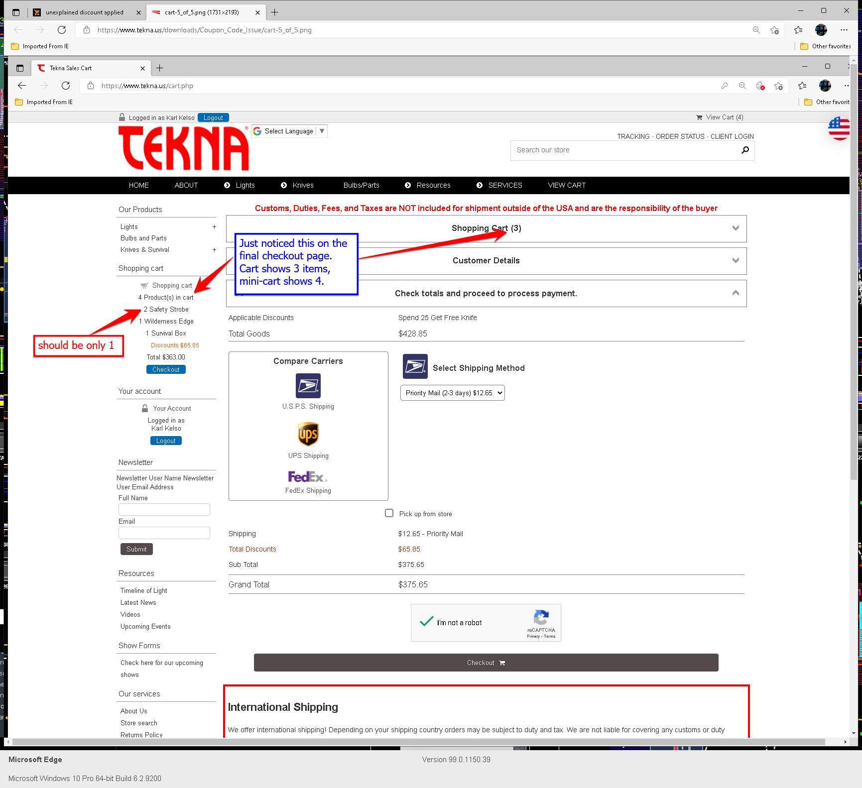 Hi Vince, The mystery deepens. I believe I have the product and discount code set up correctly with this coupon/discount applied only to the one product. There is an extra discount of FSA that applies to this order because it's over $90 and that seems to be working with no issues. If I add only 1 security card knife to the cart order with a min. order qty of 0 or 1 in the discount code setup, the coupon code does not apply itself. However, if I increase the number of security card knifes in the cart to qty 2 or more, the discount applies itself, and only once because the Repeat Every is set to 0. As you may tell from the discount code setup screenshot, I have 0/blank entered as a min/max quantity. Changing that min qty to any other value has a corresponding affect on the discount being applied in the cart. ex, change min qty to 3, and discount won't apply until changing cart qty of security card knife to 3 or more. The frustrating thing is I just can't get it to work for ONE security card knife in the cart order. Here's the screenshots: https://www.tekna.us/downloads/Coupon_Code_Issue/coupon_code_setup.pnghttps://www.tekna.us/downloads/Coupon_Code_Issue/does_not_work_with_QTY_1.pnghttps://www.tekna.us/downloads/Coupon_Code_Issue/discount_works_with_QTY_2.pngBest, Karl (still confused)...