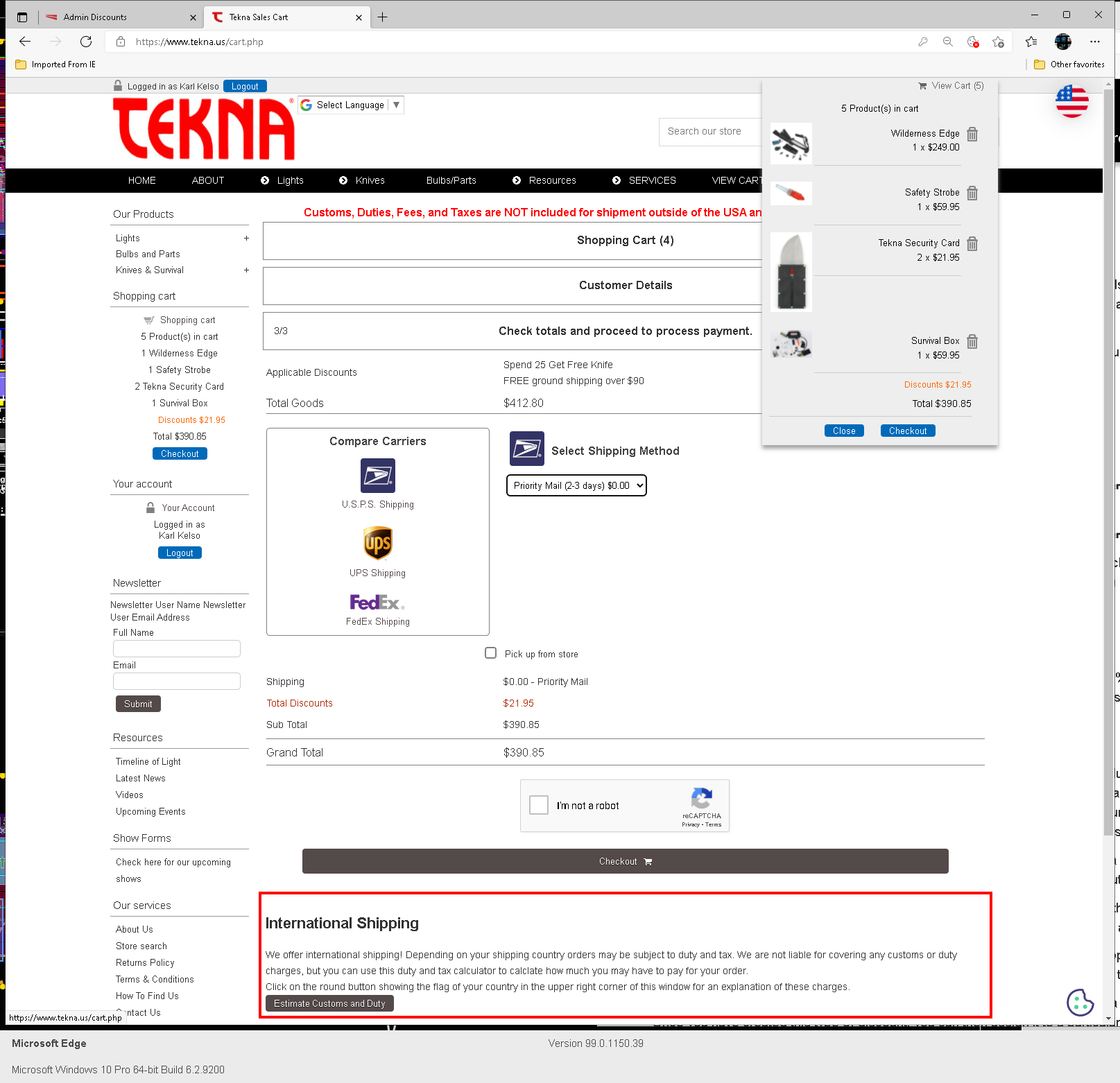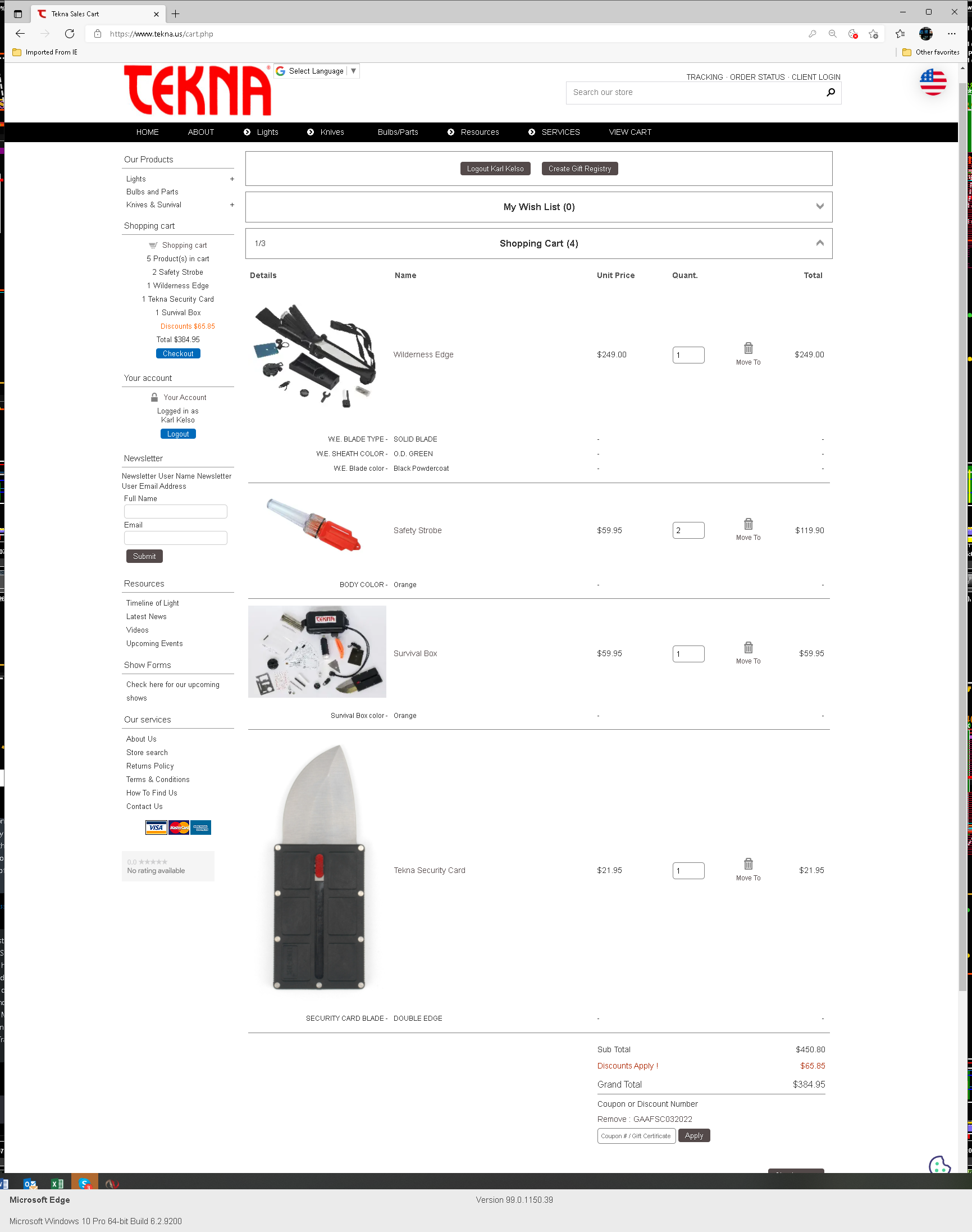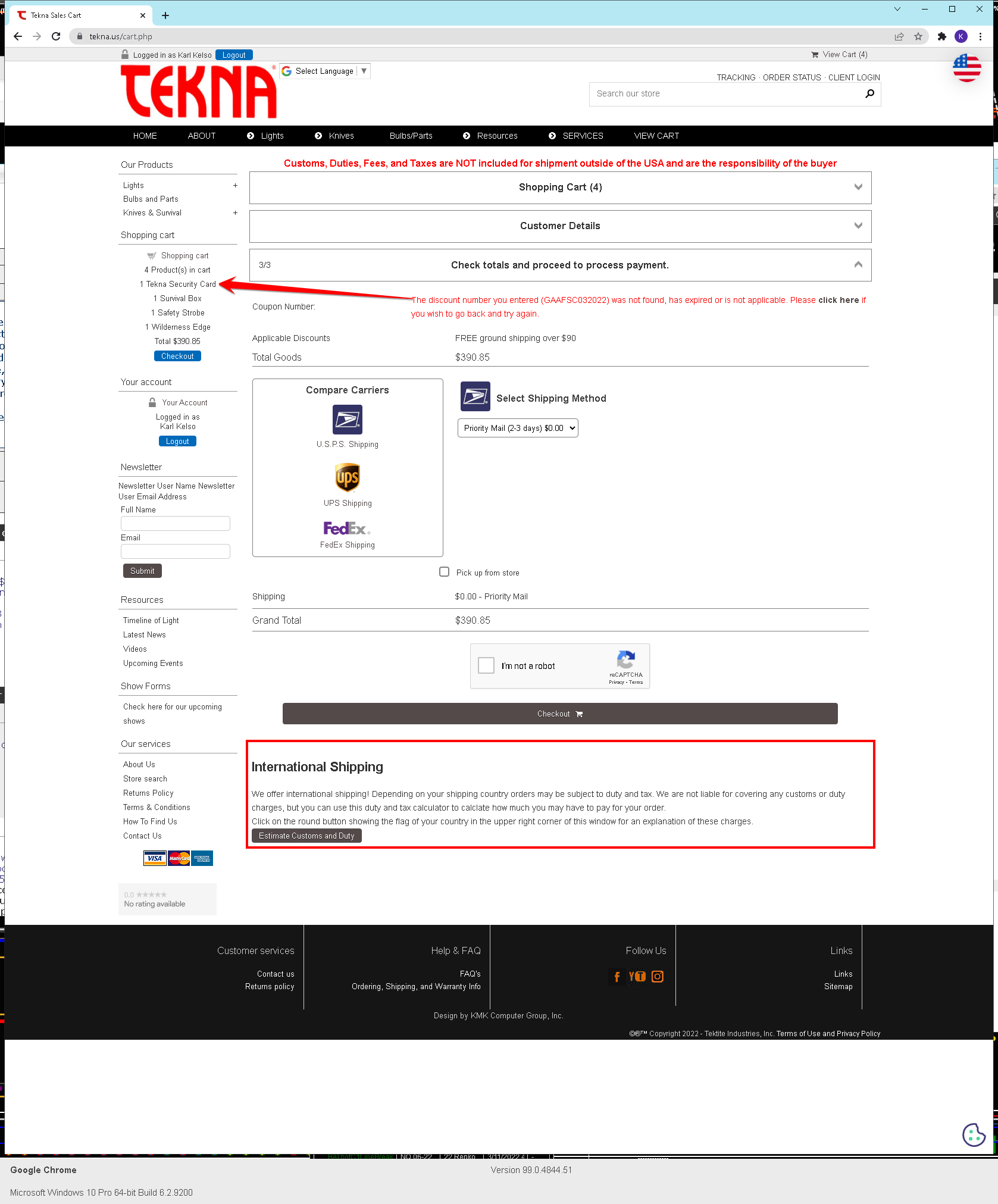Hi Vince, The mystery deepens. I believe I have the product and discount code set up correctly with this coupon/discount applied only to the one product. There is an extra discount of FSA that applies to this order because it's over $90 and that seems to be working with no issues. If I add only 1 security card knife to the cart order with a min. order qty of 0 or 1 in the discount code setup, the coupon code does not apply itself. However, if I increase the number of security card knifes in the cart to qty 2 or more, the discount applies itself, and only once because the Repeat Every is set to 0. As you may tell from the discount code setup screenshot, I have 0/blank entered as a min/max quantity. Changing that min qty to any other value has a corresponding affect on the discount being applied in the cart. ex, change min qty to 3, and discount won't apply until changing cart qty of security card knife to 3 or more. The frustrating thing is I just can't get it to work for ONE security card knife in the cart order. Here's the screenshots: https://www.tekna.us/downloads/Coupon_Code_Issue/coupon_code_setup.pnghttps://www.tekna.us/downloads/Coupon_Code_Issue/does_not_work_with_QTY_1.pnghttps://www.tekna.us/downloads/Coupon_Code_Issue/discount_works_with_QTY_2.pngBest, Karl (still confused)...