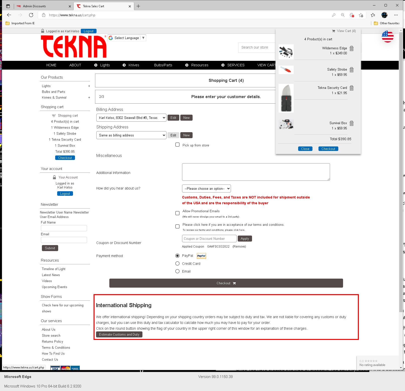 Hi Vince, Thank you. This issue started when I initially set the scope to assign to an individual product / cat and the code simply would not work. If entered while on the cart, with the correct product in the cart, it states that it's applied yet the discount amount is not taken off the cart total, e.g. does not show the wording 'discount' or make the price adjustment in the cart total column. https://www.tekna.us/downloads/Coupon_Code_Issue/code_applied_no_discount.pngWhen proceeding to checkout, an error message is shown that the code was not found, expired, or is not applicable, with the correct product still in the cart. That is still the issue. https://www.tekna.us/downloads/Coupon_Code_Issue/code_applied_no_discount_2.pngIf I change the scope to almost anything else, such as assigning the discount code also to the product category, ex. knives in this example, the discount works, but also includes everything else in the cart that is valid in that larger scope and not just the one individual product, even though none of the other products have the discount applied to them in the product admin. https://www.tekna.us/downloads/Coupon_Code_Issue/addendum_2.pngaiyeeeshka... Best, Karl (dazed and confused)