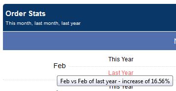 and add a new chunk of code there so it looks like the following - (new code shown in red) $sincedate = date('l jS F', strtotime('-30 days')); $sinceweekdate = date('l jS F', strtotime('-7 days')); $dbdate = date('Y-m-d H:i:s', strtotime('-30 days')); $dbweekdate = date('Y-m-d H:i:s', strtotime('-7 days')); $thismonth=date('M'); $lastmonth = date('M', strtotime('first day of last month')); $lastyear = date('M Y', strtotime('-1 year')); $lastlastyear = date('M y', strtotime('-2 year')); // echo $sincedate.' '.$dbdate; if ($thismonthtotal[0] > 0 and $thismonthtotal[1] > 0) { if ($thismonthtotal[0] > $thismonthtotal[1]) { $currmonthpct = 'Increase of '. (round($thismonthtotal[0]/$thismonthtotal[1]*100-100,2)).'%'; }else{ $currmonthpct = 'Decrease of '. (round(100-$thismonthtotal[0]/$thismonthtotal[1]*100,2)) .'%'; } }else{ $currmonthpct = 'Not enough Data to make calculation'; } if ($lastmonthtotal[0] > 0 and $lastmonthtotal[1] > 0) { if ($lastmonthtotal[0] > $lastmonthtotal[1]) { $lastmonthpct = 'Increase of '. (round($lastmonthtotal[0]/$lastmonthtotal[1]*100-100,2)).'%'; }else{ $lastmonthpct = 'Decrease of '. (round(100-$lastmonthtotal[0]/$lastmonthtotal[1]*100,2)) .'%'; } }else{ $lastmonthpct = 'Not enough Data to make calculation'; } if ($yeartotal[0] > 0 and $yeartotal[1] > 0) { if ($yeartotal[0] > $yeartotal[1]) { $thisyrpct = 'Increase of '. (round($yeartotal[0]/$yeartotal[1]*100-100,2)).'%'; }else{ $thisyrpct = 'Decrease of '. (round(100-$yeartotal[0]/$yeartotal[1]*100,2)) .'%'; } }else{ $thisyrpct = 'Not enough Data to make calculation'; } if ($last12total[0] > 0 and $last12total[1] > 0) { if ($last12total[0] > $last12total[1]) { $lastyrpct = 'Increase of '. (round($last12total[0]/$last12total[1]*100-100,2)).'%'; }else{ $lastyrpct = 'Decrease of '. (round(100-$last12total[0]/$last12total[1]*100,2)) .'%'; } }else{ $lastyrpct = 'Not enough Data to make calculation'; } ?> STEP TWO Find / Replace 4 lines as shown below FIND REPLACE 1 OF 4Find this line <td style="text-align:right;vertical-align:middle" rowspan="2"><?php print $thismonth?></td> replace with this <td style="text-align:right;vertical-align:middle" rowspan="2"><div title="<?php print $thismonth?> vs <?php print $thismonth?> of last year - <?php print $currmonthpct?>"><?php print $thismonth?></div></td> FIND REPLACE 2 OF 4Find this line <td style="text-align:right;vertical-align:middle" rowspan="2"><?php print $lastmonth?></td> replace with this <td style="text-align:right;vertical-align:middle" rowspan="2"><div title="<?php print $lastmonth?> vs <?php print $lastmonth?> of last year - <?php print $lastmonthpct?>"><?php print $lastmonth?></div></td> FIND REPLACE 3 OF 4Find this line <td style="text-align:right;vertical-align:middle" rowspan="2"><div title="January 1 - Now"><?php print "Jan 1 »"?></div></td> replace with this <td style="text-align:right;vertical-align:middle" rowspan="2"><div title="January 1 to today - <?php print $thisyrpct?>"><?php print "Jan 1 »"?></div></td> FIND REPLACE 4 OF 4Find this line <td style="text-align:right;vertical-align:middle" rowspan="2"><div title="Last 12 Months"><?php print '12 Mo.'?></div></td> replace with this <td style="text-align:right;vertical-align:middle" rowspan="2"><div title="Last 12 Months - <?php print $lastyrpct?>"><?php print '12 Mo.'?></div></td> That's it - Upload the file and give it a test drive. :::ASP VERSION:::STEP ONEAround line 230 or so, look for the following block of code lmdate=date()-day(date()) sincedate = date()-30 ' sinceweekdate = date('l jS F', strtotime('-7 days')); dbdate = date()-30 dbweekdate = date()-7 thismonth=monthname(month(date()),TRUE) lastmonth=monthname(month(lmdate),TRUE) lastyear=monthname(month(lmdate),TRUE)&" "&(year(date())-1) %>