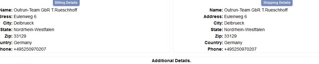 (05:44:43 PM) Jordan S.: I viewed the .XML data from the order feeds to show me what the exact information that is importing from your store. Here is the raw Ship To data. (05:44:45 PM) Jordan S.: <ShipTo> <Name> <![CDATA[Outrun-Team GbR T.Rueschhoff]]> </Name> <Company> <![CDATA[]]> </Company> <Address1> <![CDATA[Eulenweg 6]]> </Address1> <Address2> <![CDATA[]]> </Address2> <City> <![CDATA[Delbrueck]]> </City> <State> <![CDATA[10]]> </State> <PostalCode> <![CDATA[33129]]> </PostalCode> <Country> <![CDATA[DE]]> </Country> <Phone> <![CDATA[+495250970207]]> </Phone> </ShipTo>