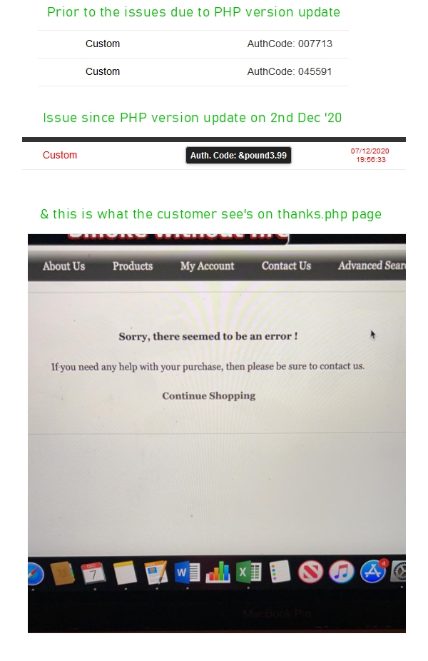 History - This site owner setup & looks after his own site, it's been online about 5 years, no issues until the hosting company updated & removed PHP 5.6 & updated all sites to PHP 7.x. Site owner had no warning until orders stopped, & this site takes masses of orders, so they knew almost instantly there's something amiss. This is when my phone starts to ring, Happy Days!  The site has been on ECT V 6.5.x for a good while, cust can't recall how long, & to get it going I had to put up a later version of incfunctions.php, which brought the site back online, albeit not exactly how it should be. I ran a 7.2 updater & the site is back, albeit needing a few tweaks, & it functions 99% as before. Prior to this stage trying to access any webpage for the site resulted in zilch. But when customer has made payment on the Worldpay site they are usually returned to site & the thanks page & the order is automatically authorised in the admin. That isn't happening & orders now need authorising. Payments are being received. What is being displayed to the customer is one the following screens With the original customppreturn.php file the screen below is shown,  With the later customppreturn.php file the screen below is shown  The site only has Worldpay as a payment provider. The reason I put up a later version of incfunctions.php is because every so often an error message was displayed on screen stating an issue in that file. There are no error message files anywhere in the site files, which I find a bit strange Ideas on a postcard please!  Steve Egerton Village, Bolton, UK