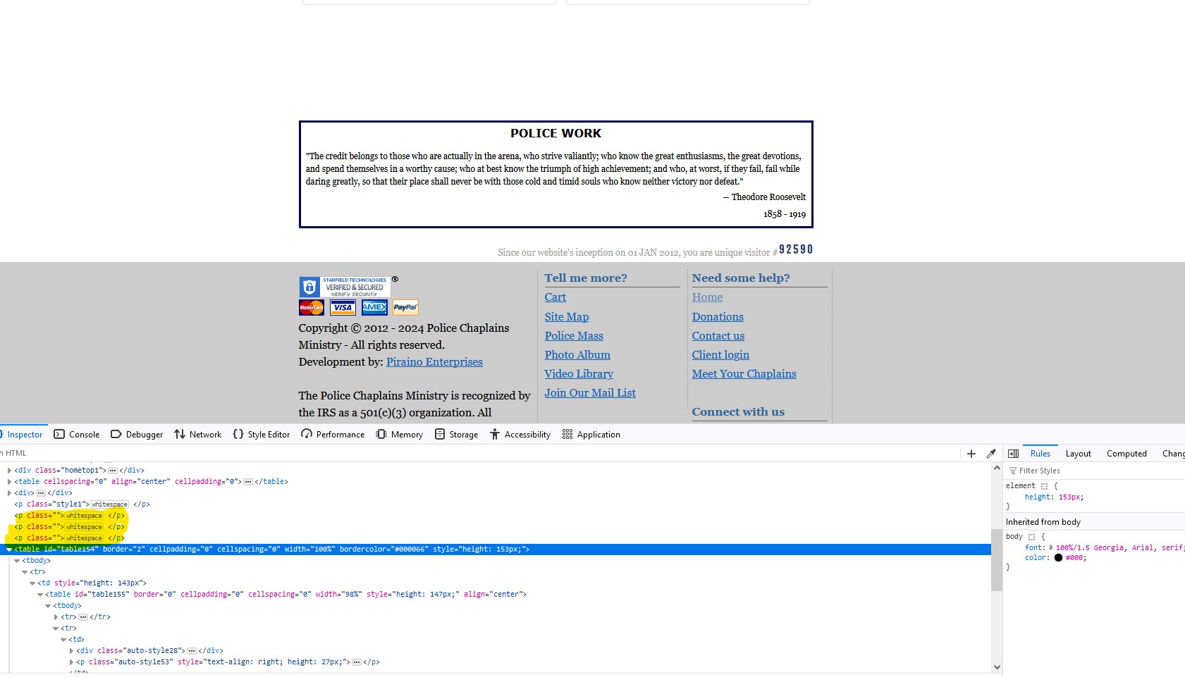 I rebuilt the index page again and got the links navigation image visible and working.  However, I'm having a problem with the bottom of the page displaying properly. I can't seem to find out why there is a big gap between the Photo Album, Video Library and the Police Work table. When I try to remove the code that I think will remove the gap, and resize and move over the police work table the navigation image disappears again.  Also, the text in the Photo Album and Video Library "prod" cells drops down out of the cells into the police work table when looking at it through a cell phone. See page links. I would like it to look and work like the bottom of the old index page. New index page with the problem at the end of the page. https://www.chicagopcm.org/index.phpOld index page that shows how the bottom should look. https://www.chicagopcm.org/index-X.phpOnce I get the new index page looking and working correctly, I still have to get the navigation drop down to work in cell phone view. Yours Truly, Paul P. Longtime ECT Customer