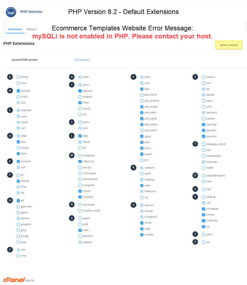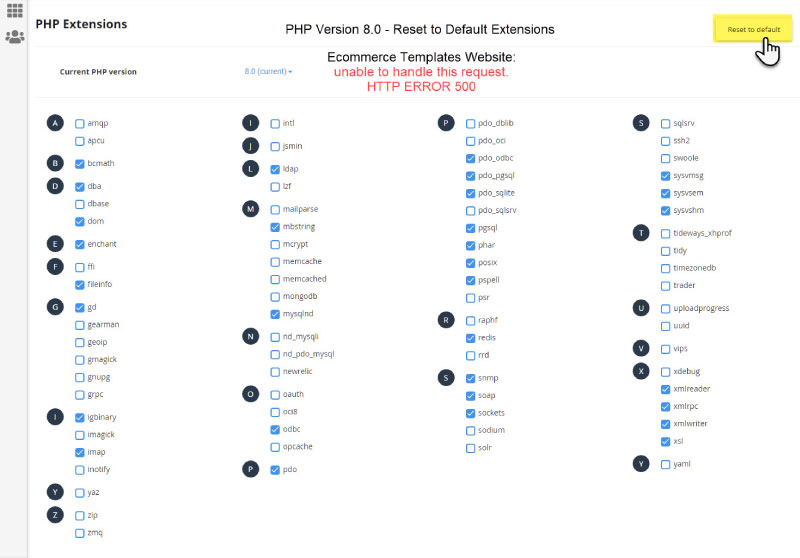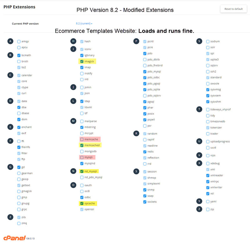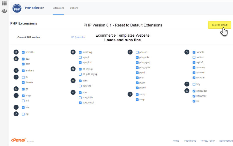 Hi Gary It seems that different hosts have different setups within cPanel for their PHP versions selector & using the default cPanel setup on the server caused the site not to show, I was left with a polar bear in a snow storm effect A good while back I tried switching to PHP 8 & ended up with the site not visible & that was using the defaults. So, toward back end of '21 I revisited the issue on an ECT site but still had similar issue. So I started enabling the PHP extensions in cPanel & the site has worked fine ever since. I also read up on the various extensions on what they do, don't do & security issues etc to minimise my choices & not end up making a pigs ear. I'm no server boffin as there appears no 'handbook' of definite do's, don'ts, maybes or maybenots. The only clients cPanel site that I do not host has zero PHP extension selector / choices, just a straight version change & their site will not show at all when switched to 8.0. That bridge will need crossing sooner than later! The site where this all seems to function fine with has zero mod's add-ons, MagicZoom Plus & a customised contact form, other than that it is ECT 'out-of-the-box. I have four screenshots of the setup that has been working fine since around last Sept. The current version of cPanel is 100.0.11 on LiteSpeed server. Hope some of this may help you Gary.  The ECT admin info  The cPanel PHP selector screens    ----------------------------------- Steve Manchester UK Make it as simple as possible, but not simpler.