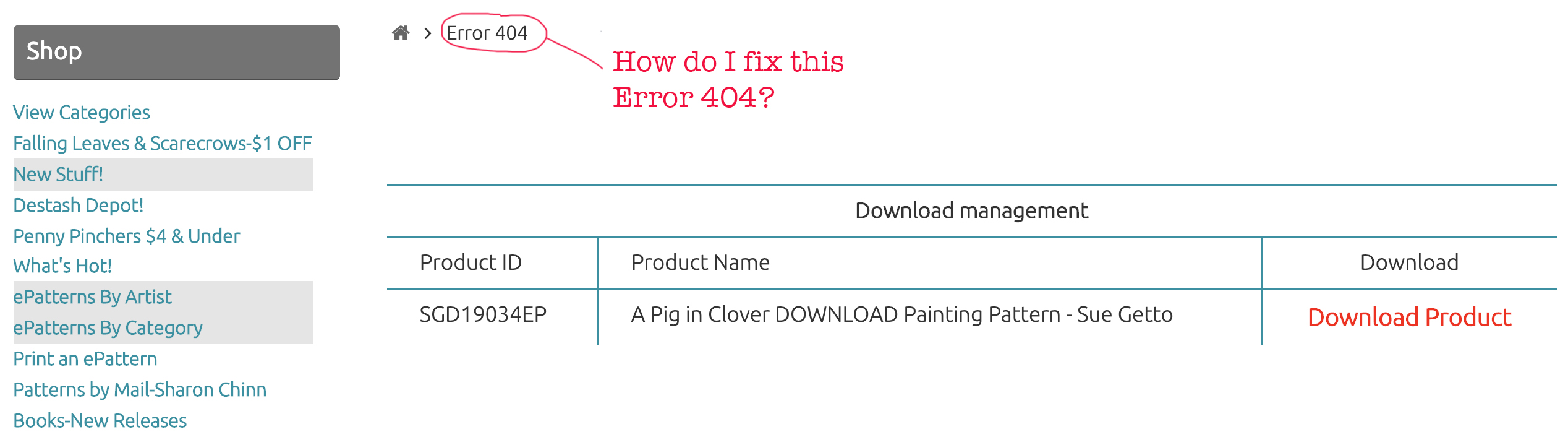 I'm getting an Error 404 in the breadcrumb at the top of my Digital Download pages. The page works, but customers see the 'Error 404' and think something is wrong. How can I fix this?