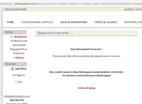 That's on an old screen shot. Here's a new one with the same error message. https://petticoatparlor.com/paypalerror.jpg